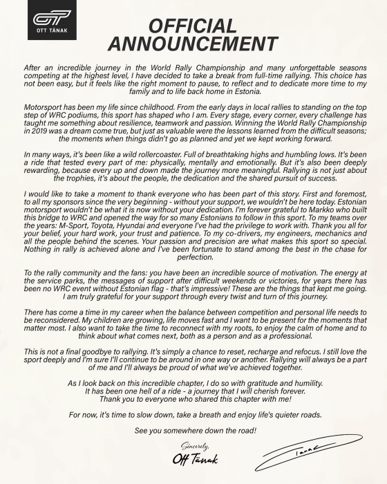 Mistrovství světaOtt Tänak končí s pravidelnou účastí v mistrovství světaO rok dříve než se očekávalo přichází Ott Tänak s důležitým oznámením. Po letošní sezóně ukončí pravidelnou účast v mistrovství světa v automobilových soutěžích. Po Kalle Rovanperovi se tak stává druhým jezdcem ze současné sestavy mistrovství světa, kterého již neuvidíme v nadcházející sezóně v boji o titul mistra světa. S koncem současné generace speciálů Rally1 a nepříliš jasnou budoucností v mistrovství světa v automobilových soutěžích se dá očekávat, že aktuální generace 'čtyřicátníků' bude směřovat svou kariéru k aktivnímu konci případně ke startům mimo mistrovství světa. Jen se čekalo, že většina z nich vydrží ještě jednu sezónu, kdy se definitivně uzavře kapitola současných superspeciálů v kategorii Rally1. Nakonec se tak nestane. Ott Tänak totiž krátce po Rally Japan vydal prohlášení, ve kterém oznamuje, že od nadcházející sezóny již nebude pravidelně startovat v mistrovství světa. Své prohlášení začal takto: „Po neuvěřitelné cestě ve WRC a mnoha nezapomenutelných sezónách strávených na nejvyšší úrovni jsem se rozhodl dát si pauzu od soutěží na plný úvazek. Toto rozhodnutí nebylo snadné, ale cítím, že nastal ten správný okamžik k zastavení, zamyšlení a věnování více času rodině a životu doma v Estonsku.“ Jak sám Ott přiznává, není to úplný konec jeho kariéry: „Toto není definitivní sbohem automobilovým soutěžím. Je to jednoduše šance se resetovat, dobít energii. Stále tento sport hluboce miluju a jsem si jistý, že s ním budu nějak spjatý i nadále. Rally bude vždy součástí mě a vždy budu hrdý na to, čeho jsme společně dosáhli. V mé kariéře ale nastal čas, kdy je třeba přehodnotit poměr mezi soutěžením a osobním životem. Moje děti rostou, život rychle ubíhá a já chci být přítomen v těch nejdůležitějších okamžicích.“ -plu- ; AutoSport.CZ